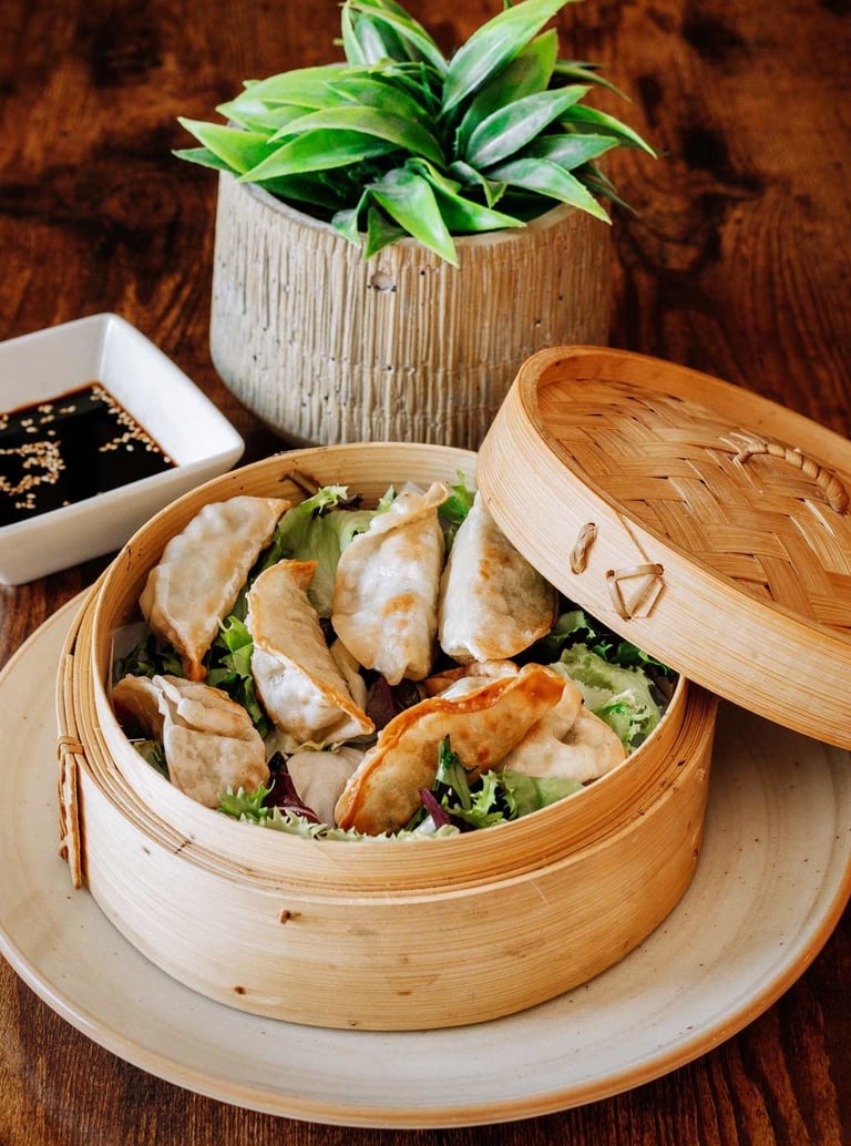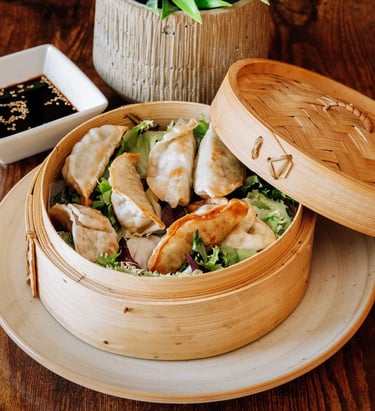 Pan bao con calamaritos, cebolla caramelizada y mayonesa de tinta (2 uds.)
